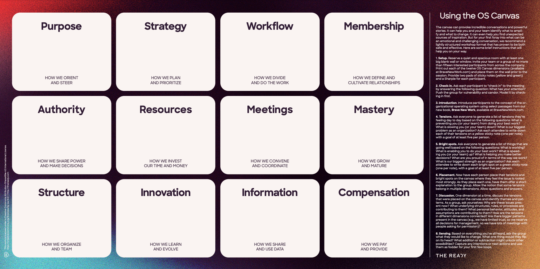 As a starting point for the facilitation process we can use a process like The Ready’s OS canvas. This provides a simple starting set of questions to outline the desired set organisational relationships and functions. From here the appropriate patterns from the pattern library can be chosen to implement these.